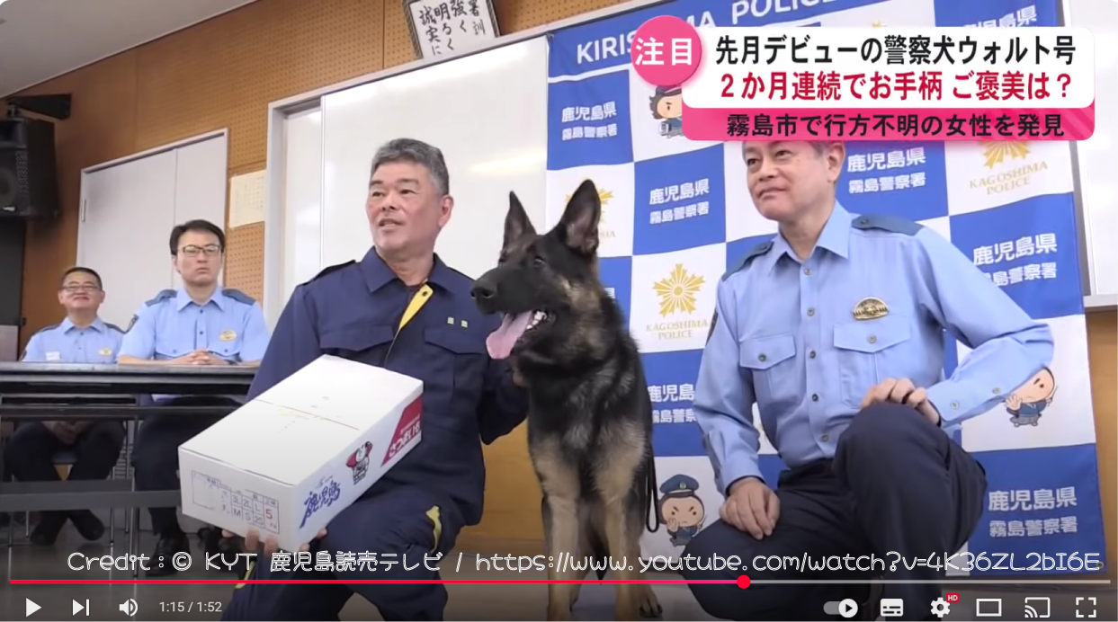 鹿児島県警のルーキー警察犬「ウォルト・フォム・ネーベル・ドルフ号」(1歳)が大きなお手柄を挙げています。