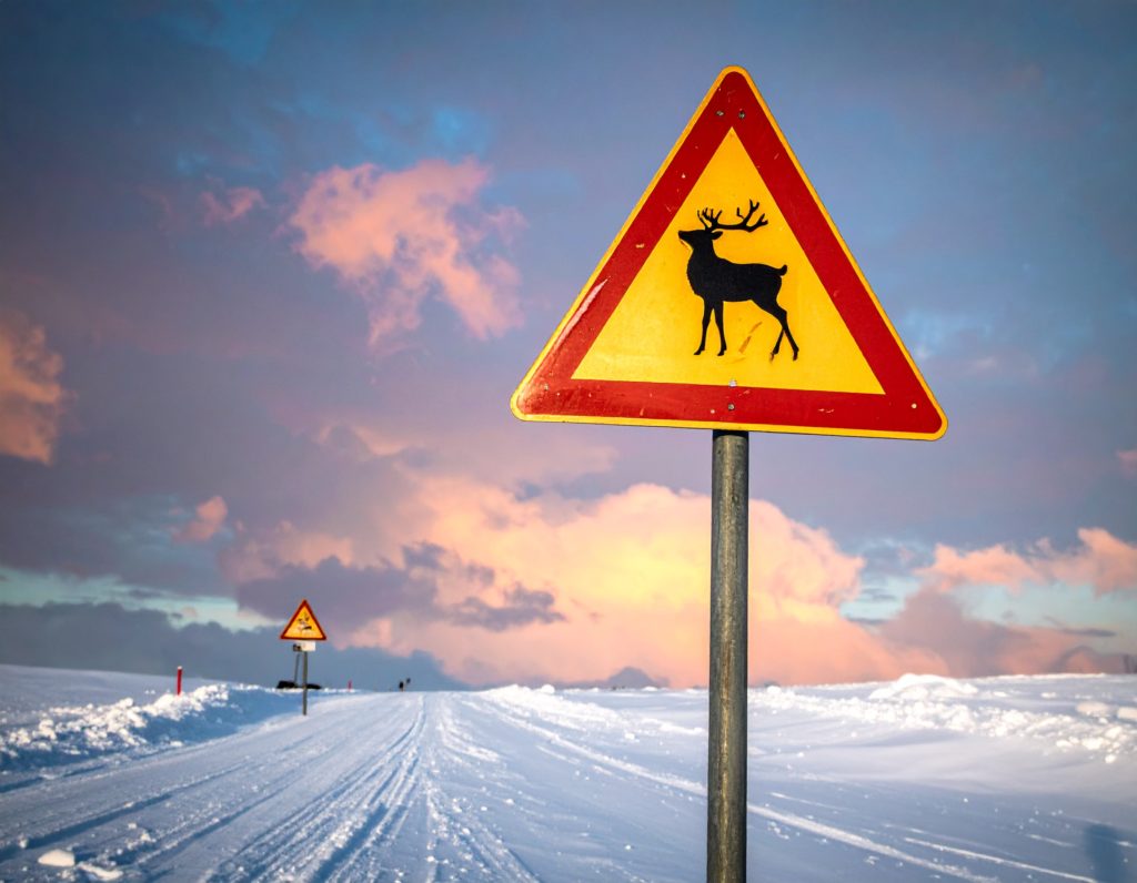 🦌 ノルウェー|雪道のトナカイ横断注意