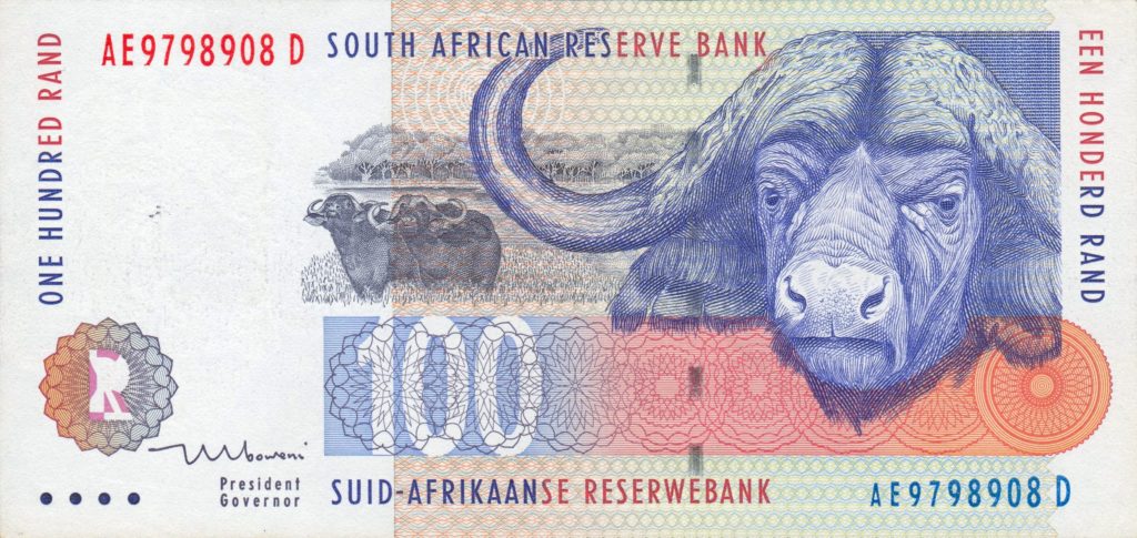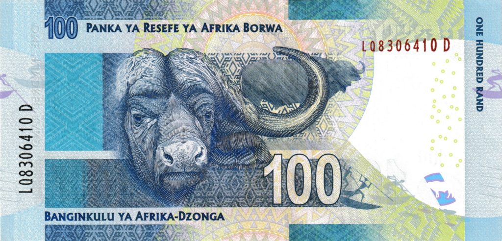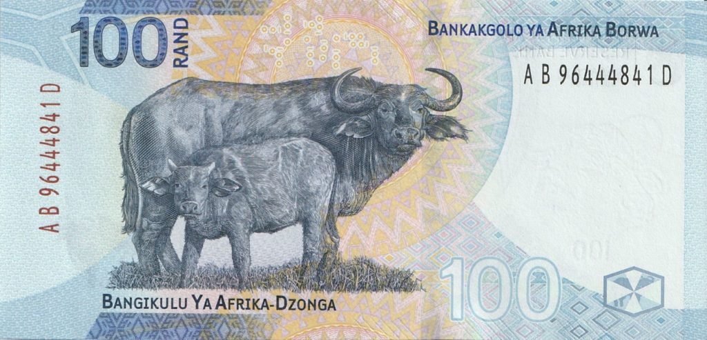 | 💡右に ネルソン・マンデラの肖像 ✨ 💡背景は青を基調とした多色刷り | 💡中央に ケープバッファローの大きな顔 🐃 💡南アフリカの多文化社会を反映した多言語表記 |